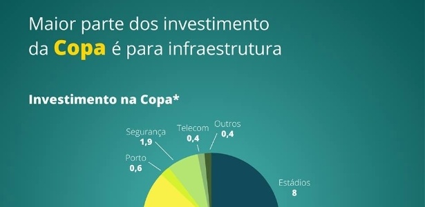 O governo federal afirma que a maior parte do investimento da Copa é em infraestrutura. Para chegar a essa conclusão, ele compara o que foi aplicado em estádios com o investido em aeroportos, portos e outros projetos incluídos na Matriz de Responsabilidades do Mundial juntos. Isso porque, considerando todos os tipos de investimentos contidos nessa mesma matriz separadamente, o gasto com estádios já é o maior de todos.