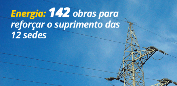 O governo diz que a Copa do Mundo de 2014 serve para, entre outras coisas, acelerar investimentos no setor energético do Brasil. Na imagem divulgada em redes sociais, o governo informa que 142 obras para reforçar o suprimento de energia estão ligadas ao Mundial. Porém, faltando cinco meses para o torneio, só 80 delas estão prontas.