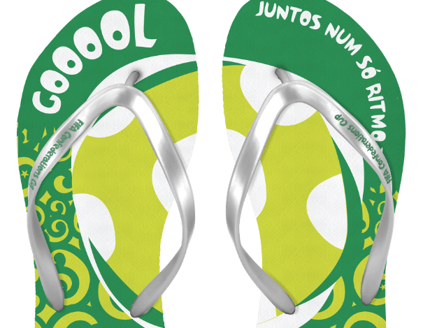 - As sandálias trazem o mascote Fuleco, o logotipo e o slogan oficial do evento: "Juntos, num só ritmo" Divulgação Mais