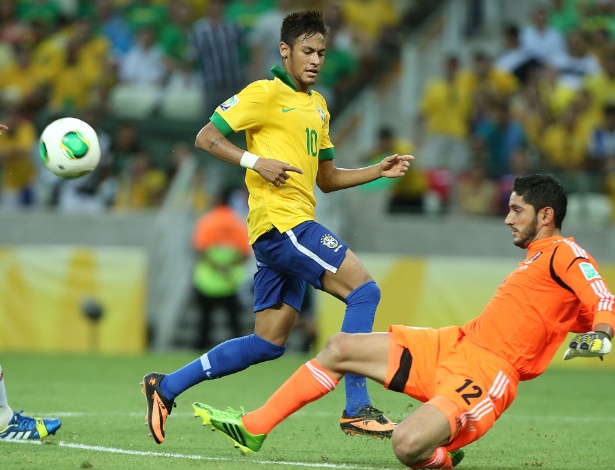 - 19.jun.2013 - Neymar tenta a jogada, mas goleiro mexicano Corona sai nos pés do jogador brasileiro Flavio Florido/UOL Mais