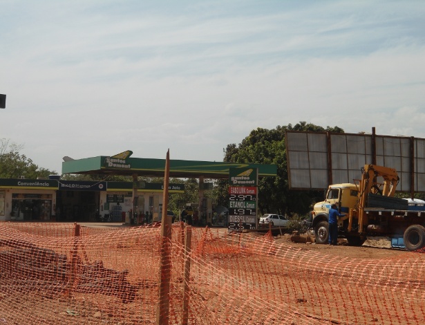 - Traçado do canteiro de obra do VLT em Cuiabá "contorna" posto de gasolina próximo ao aeroporto da cidade: desapropriações não saíram a tempo Aiuri Rebello/UOL Mais