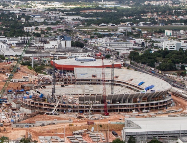Um operário foi encontrado morto no canteiro de obras da Arena Amazônia, em março. Segundo a construtora, ele caiu de uma altura de 4 metros, quando caminhava sobre vigas Divulgação Mais