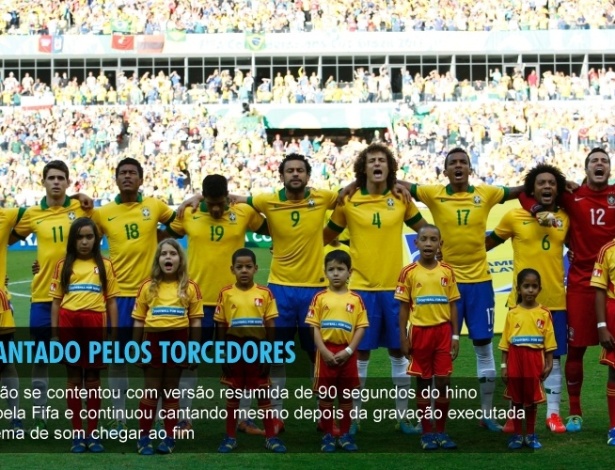 - Público não se contentou com versão resumida de 90 segundos do hino imposta pela Fifa e continuou cantando mesmo depois da gravação executada pelo sistema de som chegar ao fim Arte/UOL Mais