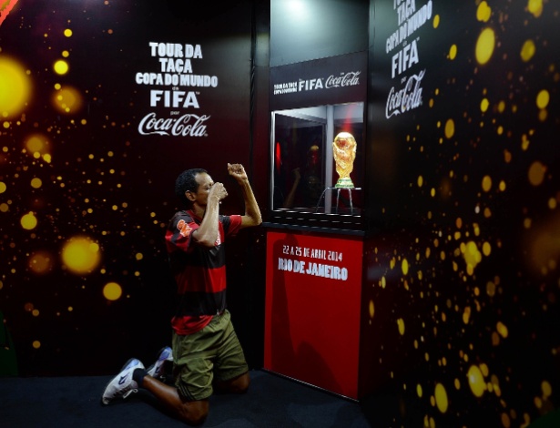 - Torcedor do Flamengo se ajoelha diante da Taça da Copa do Mundo durante evento realizado no estadio Maracanã, no Rio de Janeiro Fernando Soutello/AGIF Mais