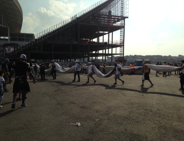 - 18.mai.2014 - Torcedores do Corinthians entram com bandeirão no Itaquerão em dia do primeiro jogo oficial do estádio Guilherme Costa / UOL Mais