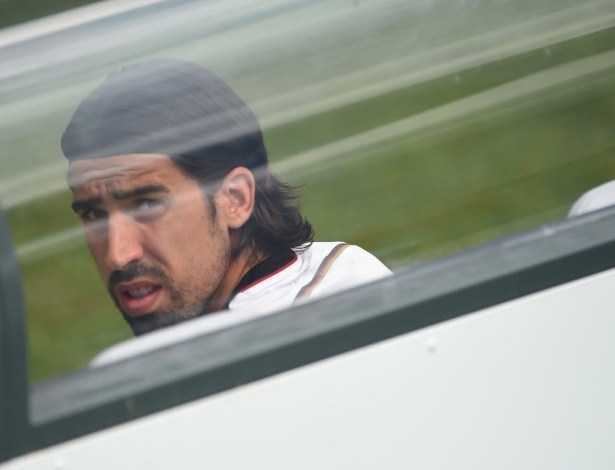 Khedira senta no banco durante treino da seleção alemã nesta quinta-feira AFP PHOTO / PATRIK STOLLARZ Mais
