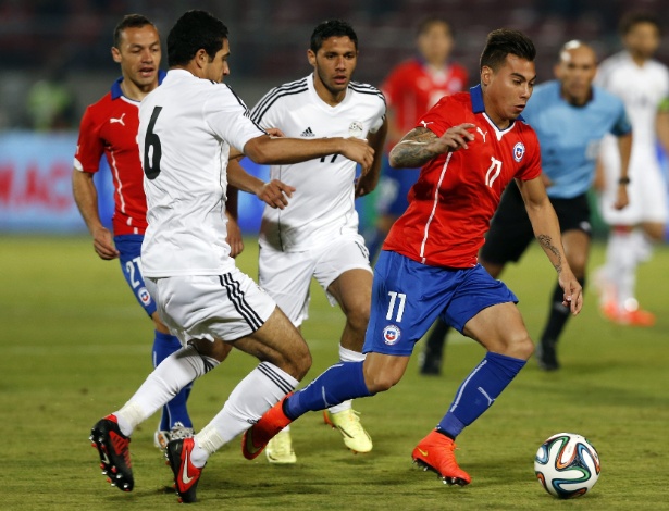 - Chileno Vargas, ex-Grêmio, é cercado pela marcação egípcia em amistoso realizado em Santiago EFE/Felipe Trueba Mais
