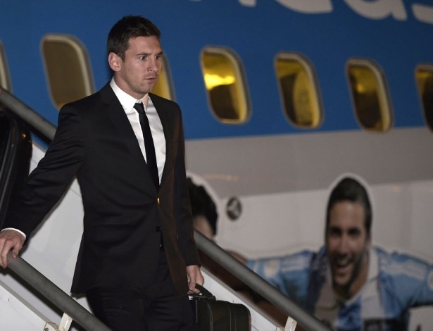 - Lionel Messi desembarca no aeroporto de Confins, em Minas Gerais, onde a seleção da Argentina vai se preparar para a Copa AFP PHOTO / Juan Mabromata Mais