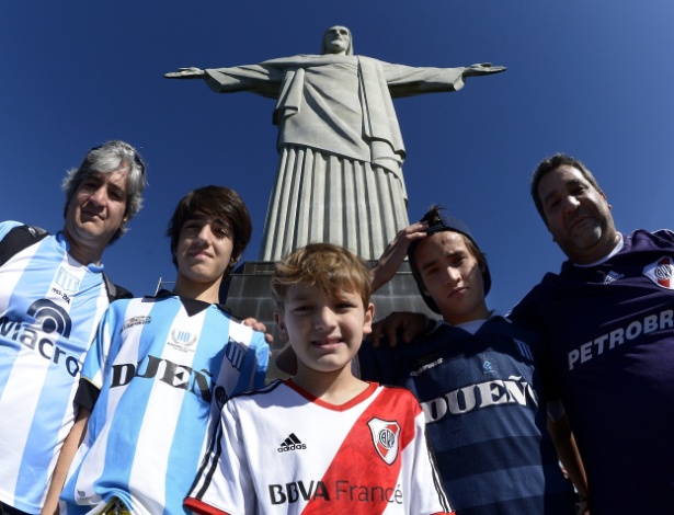 14.jun.2014 - Rivalidade entre argentinos torcedores do Racing e River Plate fica de lado em visita ao Cristo Redentor, no Rio de Janeiro AFP PHOTO / Juan Mabromata Mais
