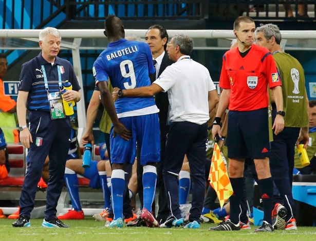 - Mario Balotelli conversa com a comissão técnica italiana ao ser substituído na vitória contra a Inglaterra REUTERS/Siphiwe Sibeko Mais