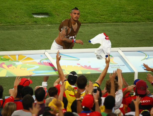 - Vidal joga sua camisa para a torcida chilena no Maracanã após a vitória sobre a Espanha por 2 a 0 Julian Finney/Getty Images Mais