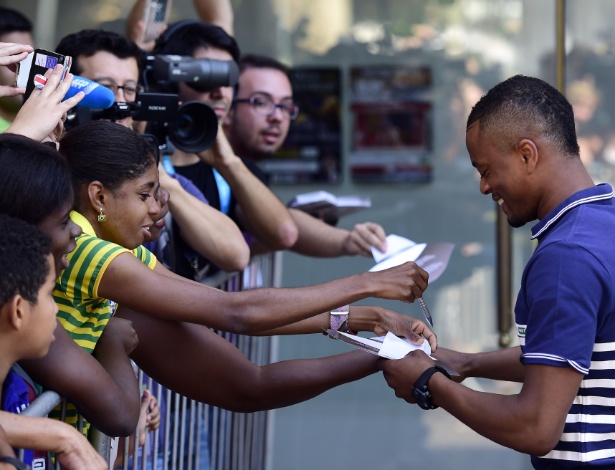 Patrice Evra dá atenção para os fãs após coletiva de imprensa em Ribeirão Preto, no interior de São Paulo AFP PHOTO / FRANCK FIFE Mais