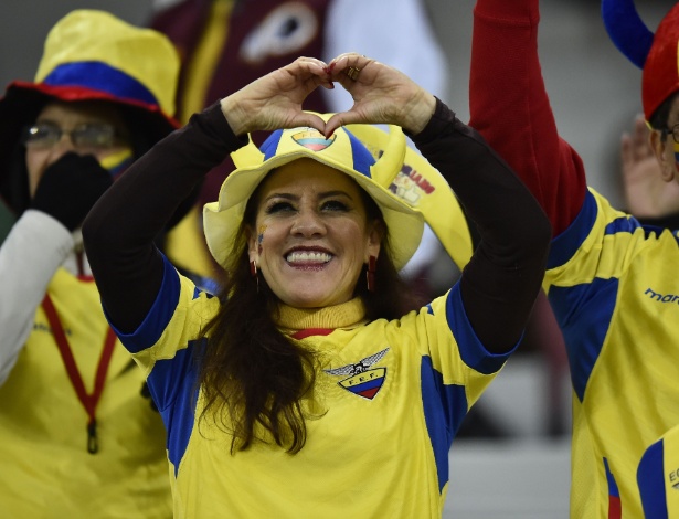 - Torcedora da seleção equatoriana faz sinal de coração para a câmera antes do início do jogo contra Honduras AFP PHOTO / RODRIGO BUENDIA Mais
