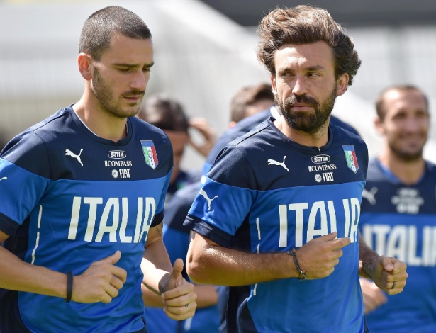 - Leonardo Bonucci (esq.) e Andre Pirlo correm durante treino da Itália em Natal. Azzurra tem jogo decisivo contra o Uruguai na próxima terça EFE/EPA/ETTORE FERRARI Mais