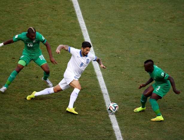 - Meia da Grécia, Kone tenta passar de marcação de dois jogadores da Costa do Marfim Robert Cianflone/Getty Images Mais