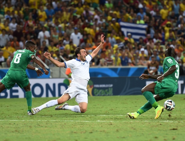 - Torosidis sofre falta de Kalou durante partida entre Costa do Marfim e Grécia, no Castelão Laurence Griffiths/Getty Images Mais