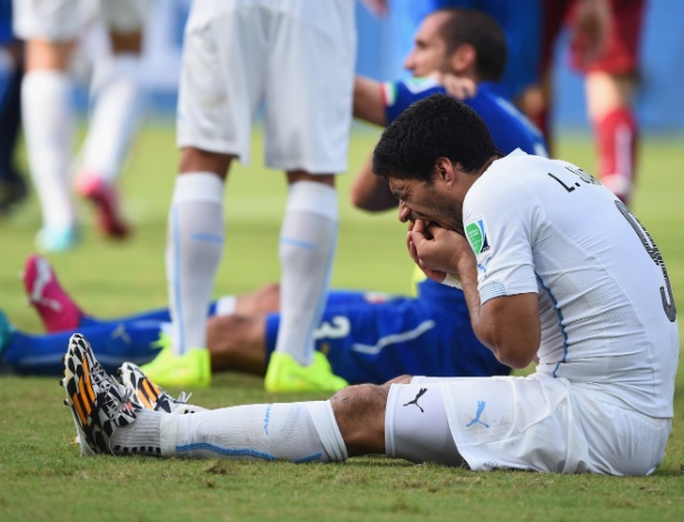 - Atacante Luis Suarez, do Uruguai, reage após ser derrubado em partida contra a Itália, na Arena das Dunas AFP PHOTO/ YASUYOSHI Mais