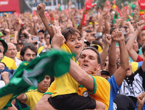 Criança celebra no colo do pai pênalti que deu a classificação para o Brasil na Fan Fest de São Paulo Paulo Anshowinhas/UOL Mais