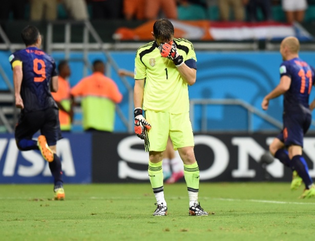 - 13.jun.2014 - Tristeza de Casillas contrasta com a alegria dos jogadores da Holanda, que venceu a partida por 5 a 1 AFP PHOTO / JAVIER SORIANO Mais
