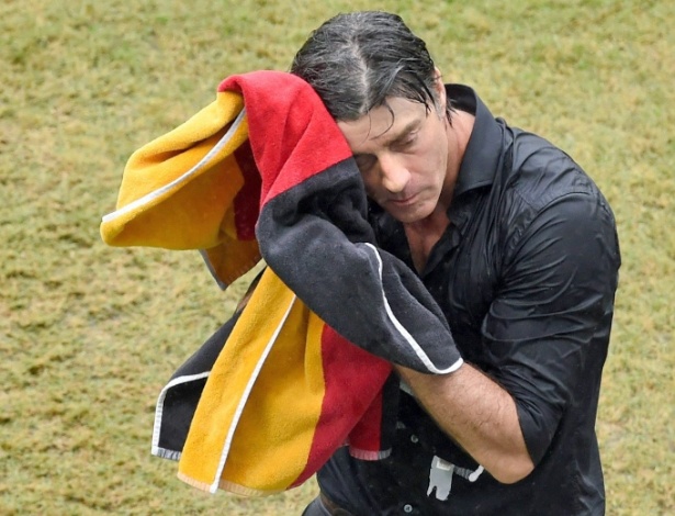 - Técnico da Alemanha, Joachim Löw, usa toalha com as cores da bandeira para secar o cabelo, após chuva na Arena Pernambuco EFE/EPA/ANDREAS GEBERT Mais