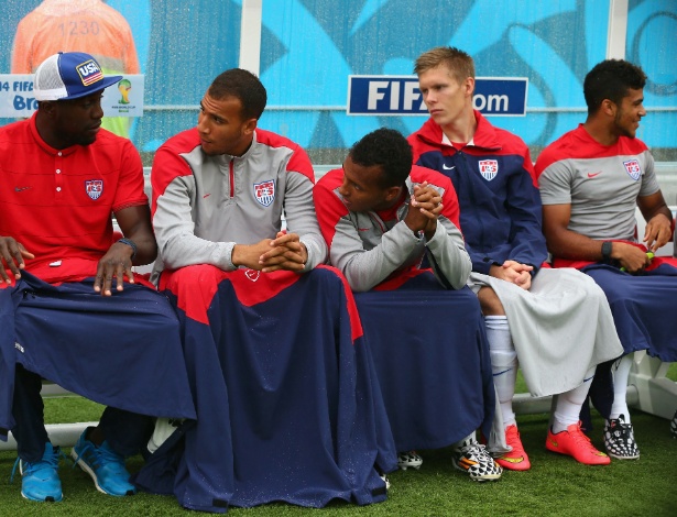 - Jogadores dos EUA se protegem da chuva no banco de reservas durante a partida contra a Alemanha, em Recife Kevin C. Cox/Getty Images Mais