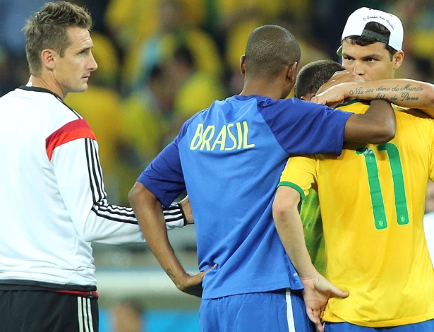 - 08. jul. 2014 - Jogadores da seleção brasileira consolam Oscar. Alemão Klose também chega perto do grupo para consolar o camisa 11 do Brasil Flávio Florido/UOL Mais