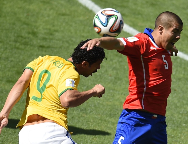 - Jô tenta o chute, marcado de perto por Medel durante as oitavas de final contra o Chile Paul Gilham/Getty Images Mais