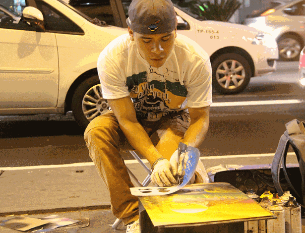 - O peruano Abel Lima coloca música para atrair mais público para assistir sua performance e comprar seus quadros Paulo Anshowinhas/UOL Mais