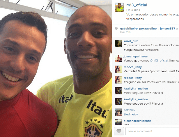 - 16.jun.2014 - O período de convivência na concentração também cria muitas amizades. O atacante Bernard escreveu para David Luiz: cada vez mais fã de você Reprodução/Instagram Mais
