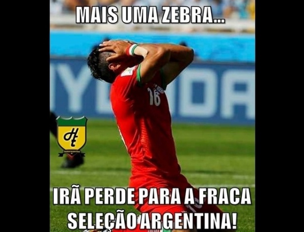 - O Irã quase aprontou para cima da Argentina. Nas brincadeiras, Argentina é quem foi a 'zebra' da partida Reprodução/Facebook Mais