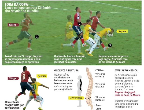 - Infográfico detalha lesão sofrida por Neymar após levar joelhada de colombiano Zúñiga durante quartas de final da Copa do Mundo Editoria de Arte/Folhapress Mais
