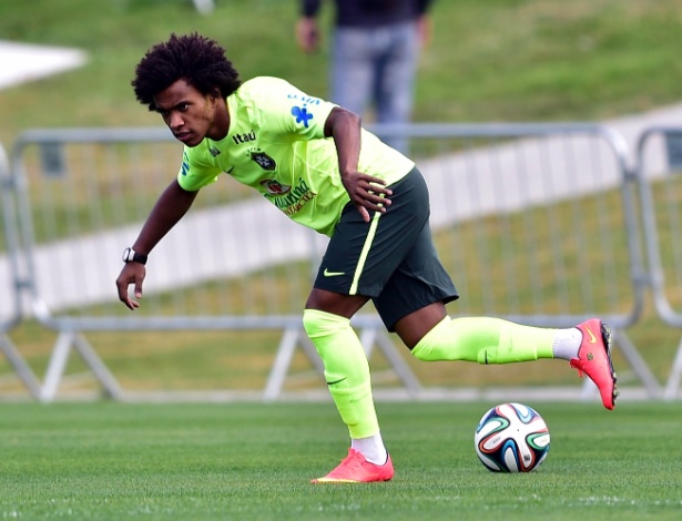 - Possível substituto de Neymar, Willian domina a bola durante treino contra o time sub-20 do Fluminense AFP PHOTO / VANDERLEI ALMEIDA Mais