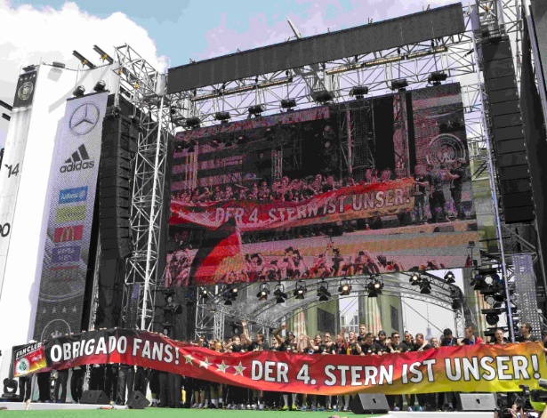 - Jogadores da Alemanha exibem faixa com mensagem em português: "Obrigado". "A quarta estrela é nossa", diz a mensagem em alemão REUTERS/Axel Schmidt Mais