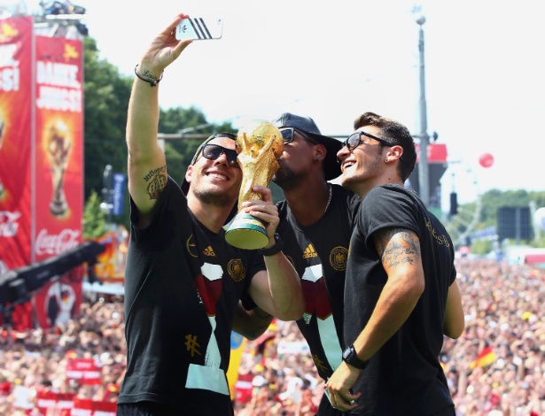 - Podolski, Boateng e Özil tiram foto com a taça da Copa do Mundo REUTERS/Alex Grimm/Pool Mais