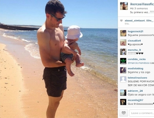 - Goleiro Iker Casillas, do Real Madrid, curte praia com filho e sua namorada Sara Carbonero Reprodução/Instagram Mais