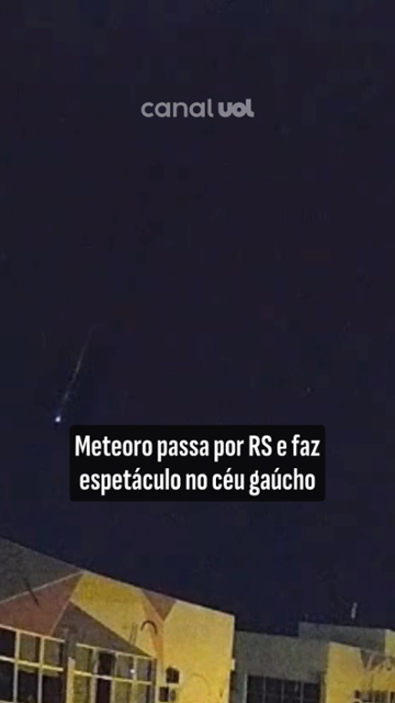 Meteoro deixa rastro vertical no céu ao cair sobre lagoa no RS; veja vídeo Um grande meteoro foi visto no Rio Grande do Sul, na noite de quarta-feira (24). Ele deixou um rastro vertical no céu, bem acima da Lagoa dos Patos, entre Porto Alegre e Pelotas.