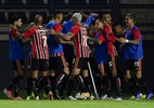 - Luis Fabiano comemora com Osvaldo e Ganso o segundo gol do São Paulo contra o The Strongest Leonardo Soares/UOL Mais
