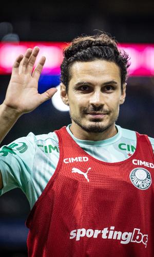 - Raphael Veiga sorri durante aquecimento da partida entre Palmeiras e Vitória Divulgação/Palmeiras Mais